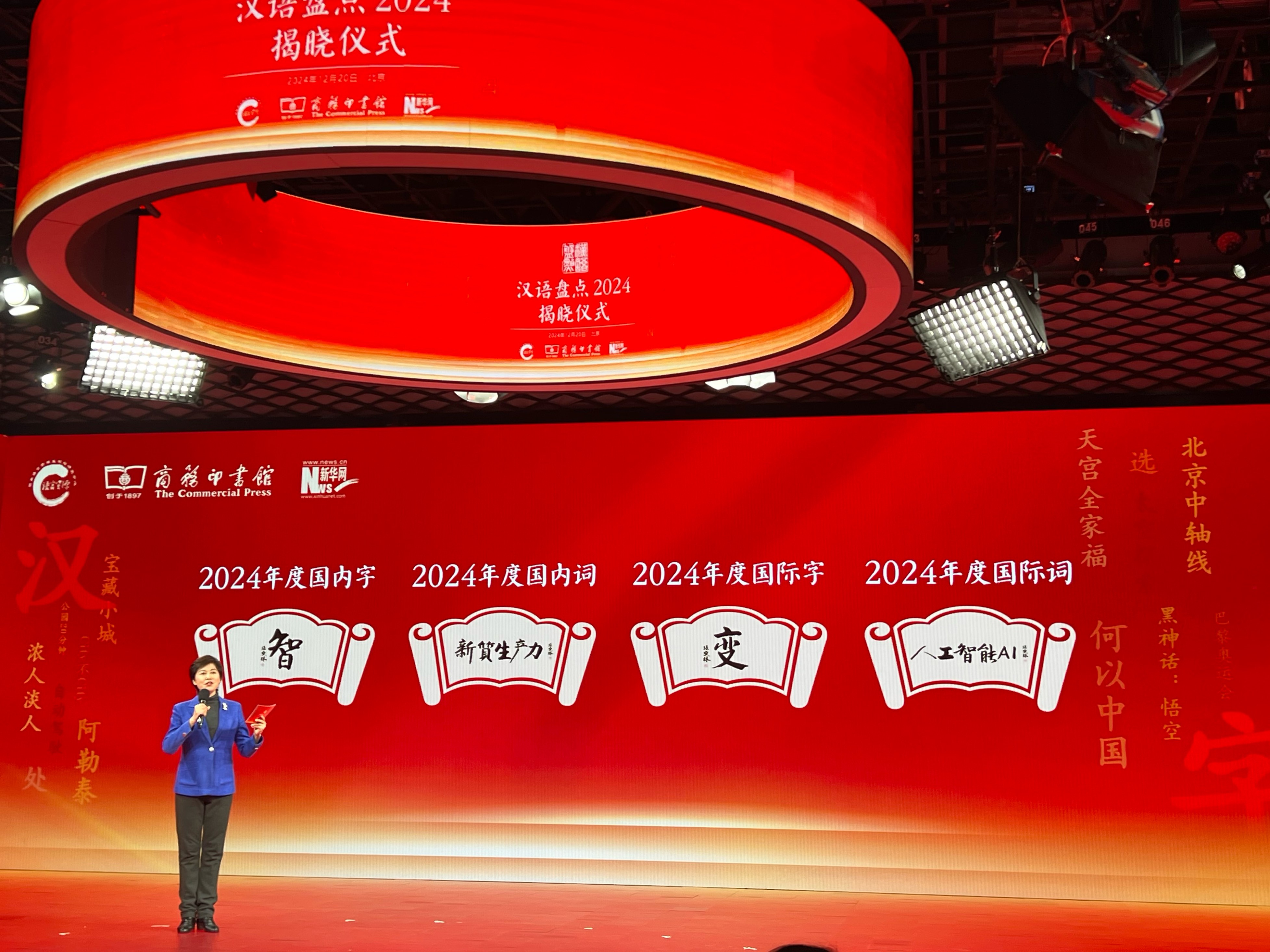 12月20日,国家语言资源监测与研究中心、商务印书馆、新华网联合主办的“汉语盘点2024”揭晓仪式在京举行。“智”“新质生产力”“变”“人工智能(AI)”分别当选年度国内字、国内词、国际字、国际词。中宣部“学习强国”学习平台编委、副总经理杜大力,中国出版集团有限公司副总经理、党组成员陈永刚,新华网党委常委、总编辑车玉明,商务印书馆党委书记、执行董事顾青,中国辞书学会会长、北京语言大学教授李宇明,中国新闻文化促进会副会长陆先高,中国经济体制改革研究会常务理事、互联网与新经济专业委员会主任祝华新,北京语言大学教授杨尔弘,华中师范大学教授何婷婷,中国传媒大学教授邹煜,武汉大学教授赫琳,商务印书馆副总经理陈晗雨,快手大数据研究院执行院长、快手科技品牌经理李文娜,百度高级产品运营经理常东升等嘉宾揭晓并点评年度字词,发布年度十大流行语、网络用语、新词语,华中师范大学教授刘延申为获奖网友代表颁奖。全国妇联副主席(兼)、中央民族大学教授蒙曼,世界体操冠军、“莫氏空翻”创始人莫慧兰,中国体操运动员、巴黎奥运会冠军邹敬园就奥运会中的故事和感想接受访谈。教育部语言文字信息管理司李强处长出席活动。“体育工作杰出贡献者”国家荣誉称号获得者,著名乒乓球运动员、教练员张燮林为活动泼墨题字,著名主持人敬一丹主持揭晓仪式。
