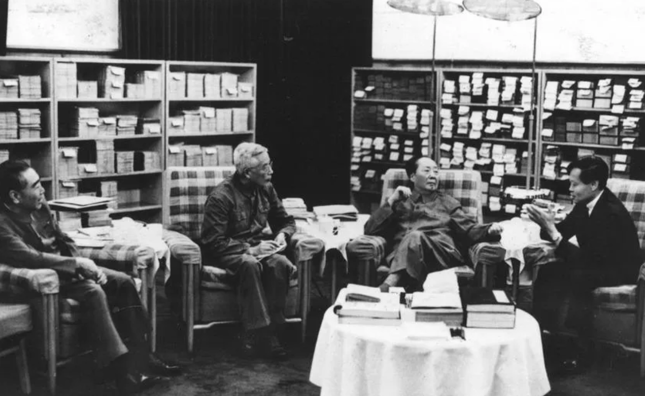 1973年7月17日,毛泽东在他那有名的书房里接见了杨振宁。左起:周恩来、周培源、毛泽东、杨振宁。(本图摘自《杨振宁传》(最新增订版))