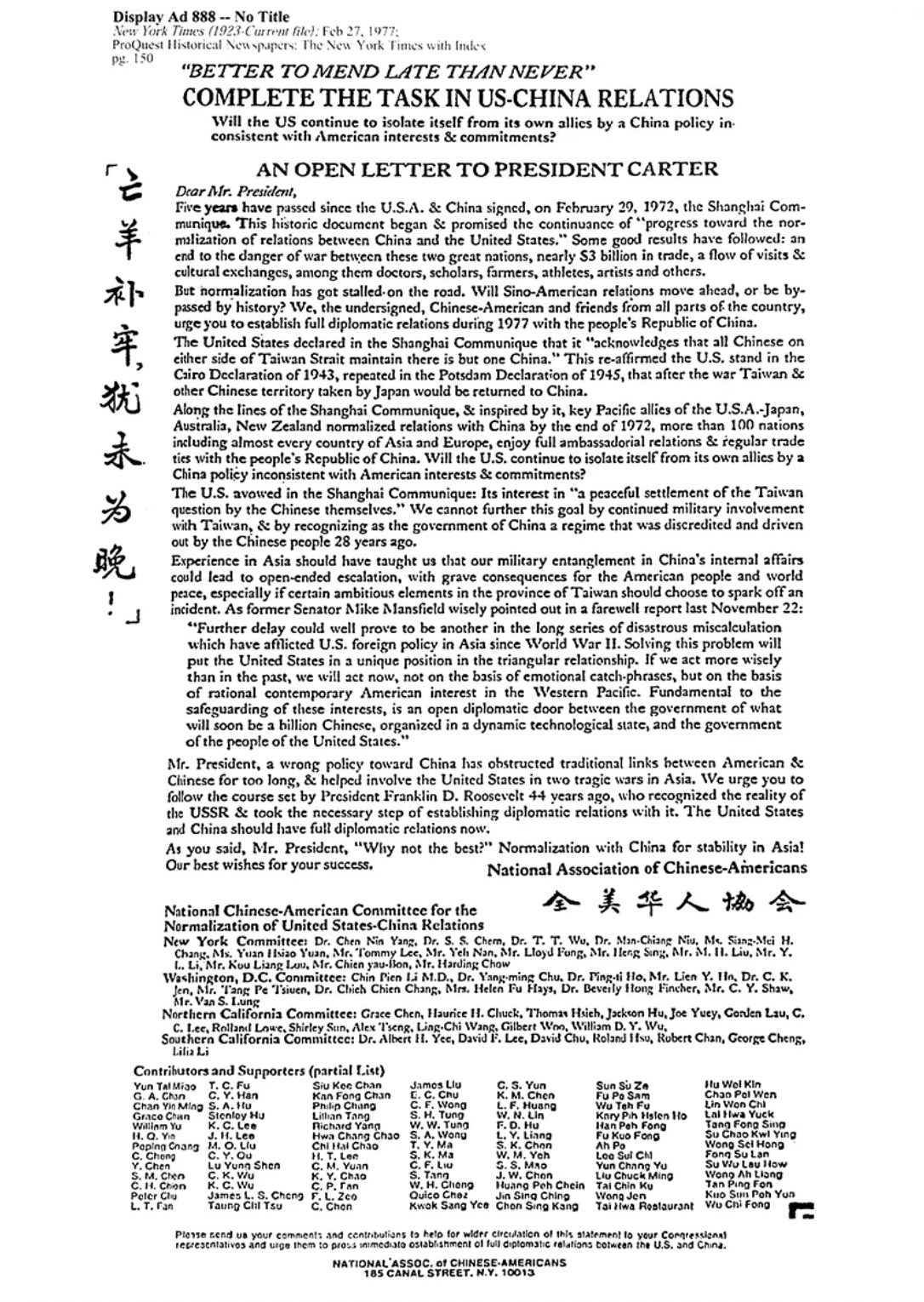 这是以杨振宁为首的全美华人协会1977年2月27日在《纽约时报》上刊登的整版广告,以“亡羊补牢,犹未为晚”为醒目标题,要求美国政府放弃孤立中国的政策,尽快同中国建交。我们知道,约两年以后,1979年1月1日,美国政府顺应历史潮流,同中国正式建立外交关系。此时,人们不应忘记杨振宁和全美华人协会在其中所做的努力。