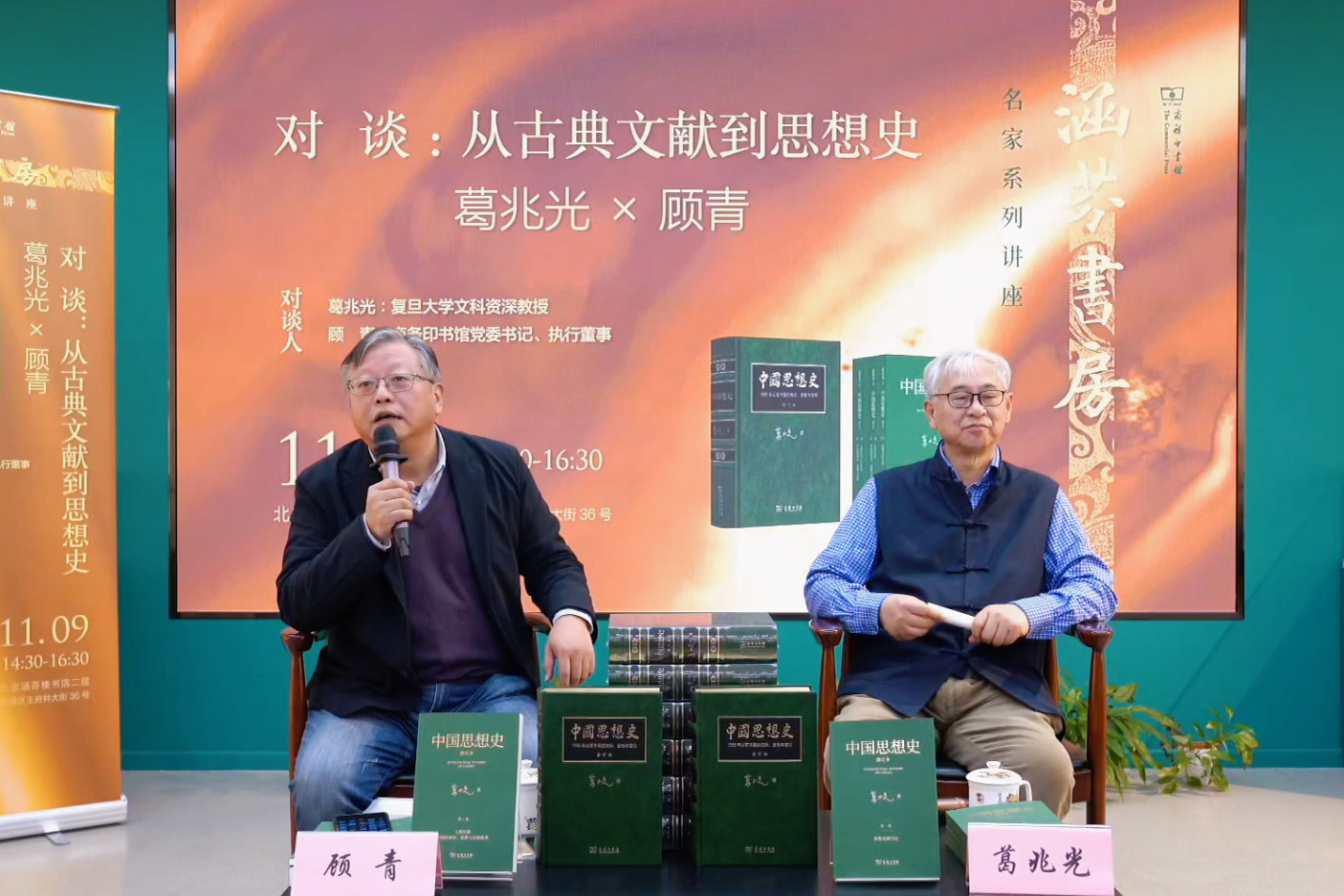 11月9日,复旦大学文科资深教授葛兆光携其新书《中国思想史·修订本》做客“涵芬书房”,与商务印书馆党委书记、执行董事顾青围绕“从古典文献到思想史”这一主题展开深度对谈,融合学术理念、治学经验与实践案例,阐释了古典文献训练的核心价值,为读者呈现了一堂兼具深度与温度的治学课。
