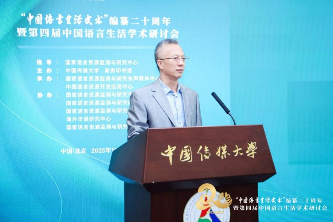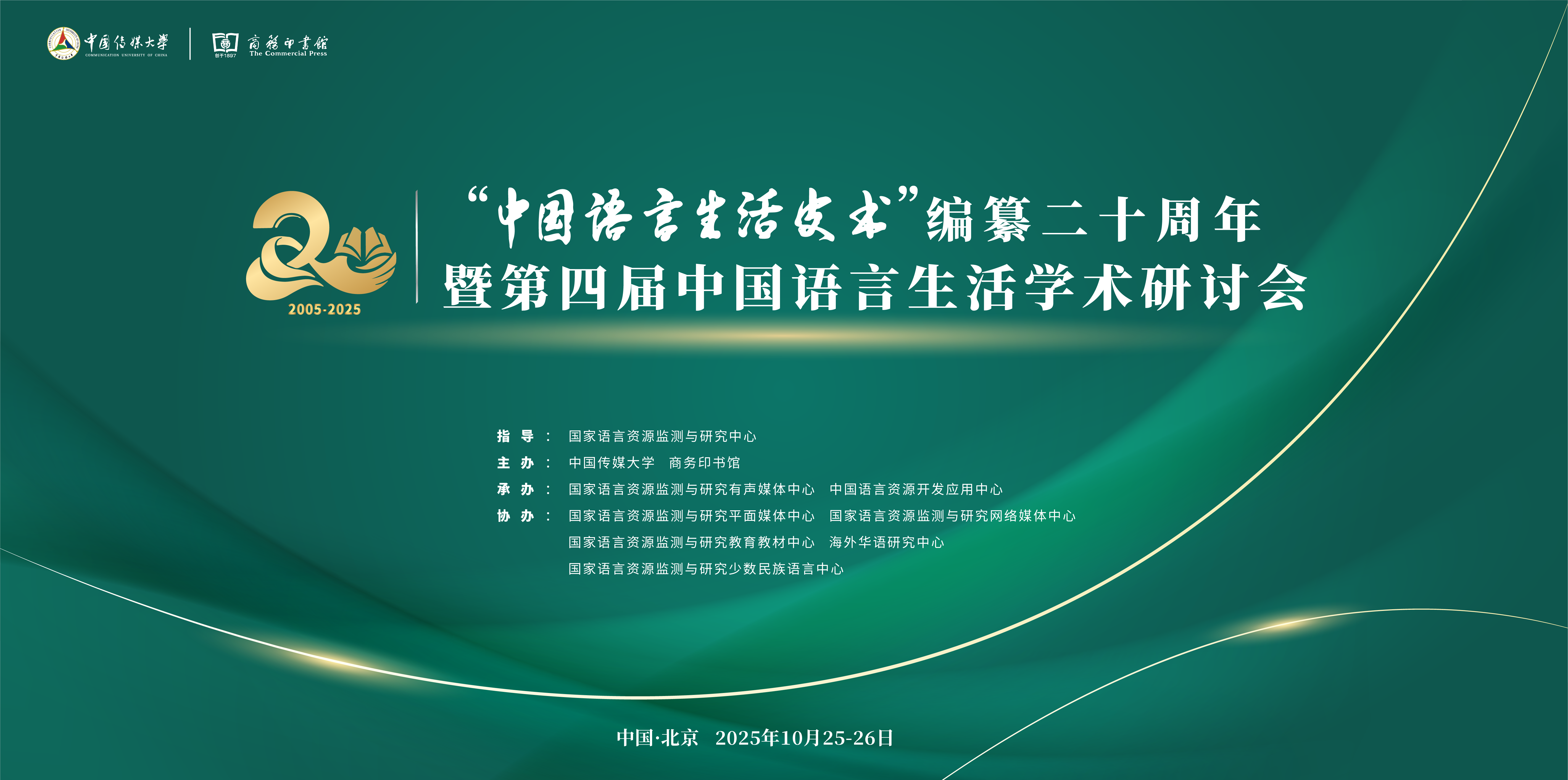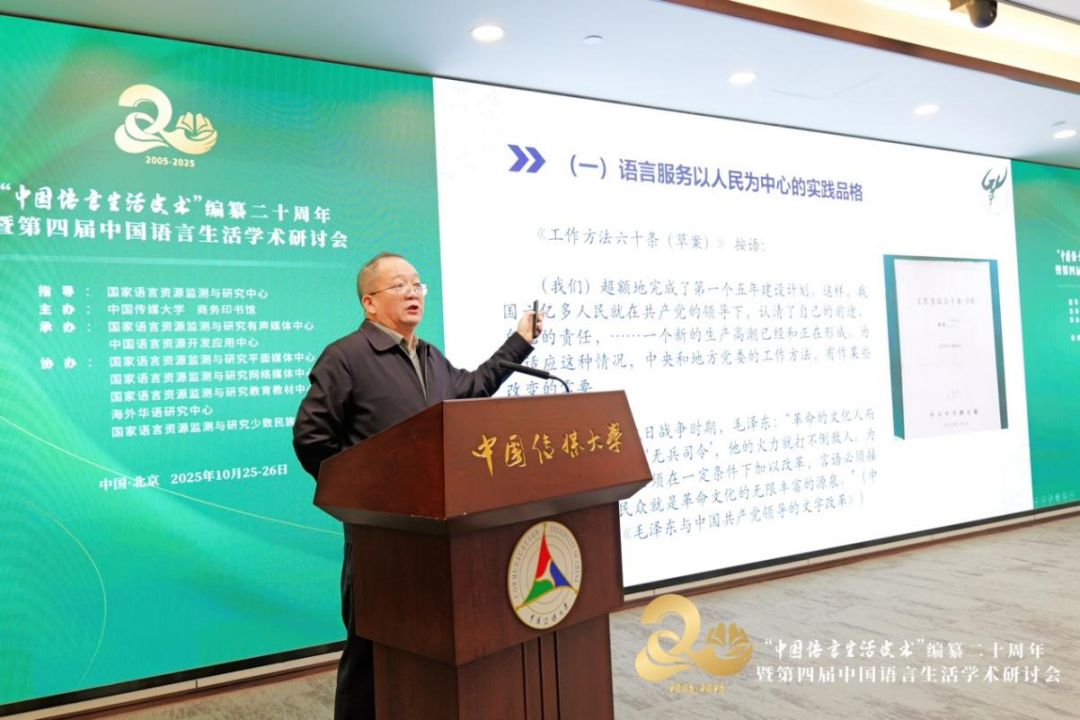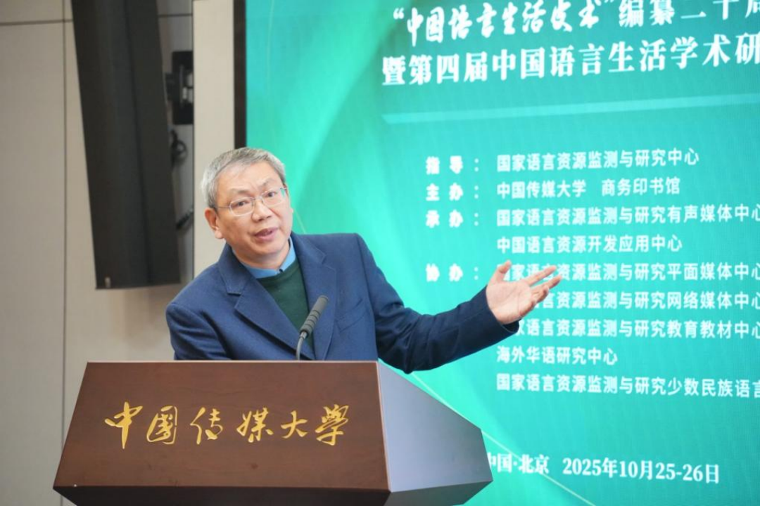 2025年10月25日至26日,“中国语言生活皮书”编纂二十周年暨第四届中国语言生活学术研讨会在中国传媒大学成功举办。本届研讨会由国家语言资源监测与研究中心指导,中国传媒大学和商务印书馆联合主办,国家语言资源监测与研究有声媒体中心、中国语言资源开发应用中心承办,国家语言资源监测与研究平面媒体中心、国家语言资源监测与研究网络媒体中心、国家语言资源监测与研究教育教材中心、海外华语研究中心、国家语言资源监测与研究少数民族语言中心共同协办。来自国内外高校、科研机构及语言政策研究部门的148位专家学者出席会议,共同回望二十年来中国语言生活研究成果,研讨智能时代语言文字事业新命题。