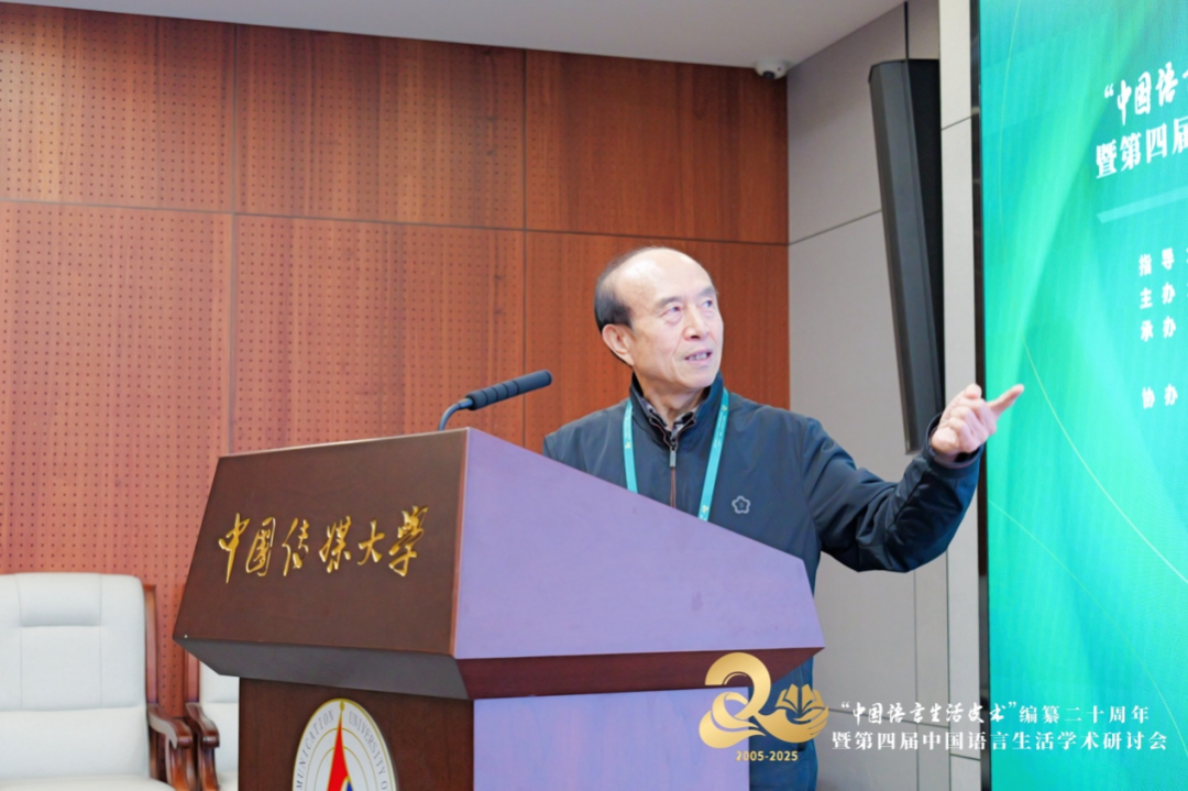 李宇明以《语言生活研究之研究》为题作大会报告,详细梳理了“语言生活”概念的确立与传播过程,指出通过绿皮书、蓝皮书、黄皮书、白皮书及地方领域皮书构成的“6+4皮书方阵”,“构建和谐语言生活”已成为国家语言文字事业的重要目标。为深化该领域研究,他提出应从数据收集、术语整理、理论构建与作用评估四个维度系统推进,重点建设涵盖语言舆情监测、语言资源保护、语言扶贫与乡村振兴、语言经济产业等八个领域的研究数据库。