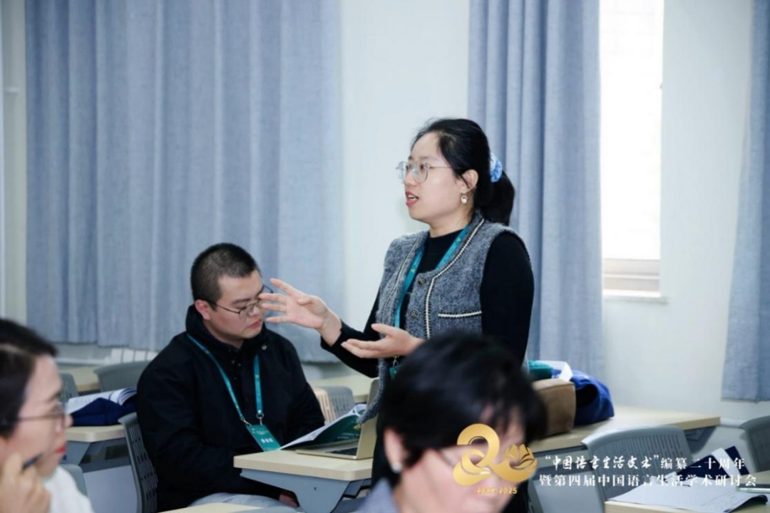 第二分会场以“人机共生的语言生活”与“语言生活皮书的编纂、影响与发展”为主题,呈现出“科技感满满、诚意满满、热情满满、收获满满”的鲜明特色。全场15个报告中,有13篇聚焦于人机共生语言生活,涵盖研究综述、理论构建与实证探索,具体涉及网络语言教育生态化转型、国际中文教育智慧课堂构建、历史内容语言治理、人机交互修补策略、现代汉语构式词典建设、方言活态传承等前沿方向;另有2篇报告深入探讨语言生活皮书的编纂与影响。会场学术氛围浓厚,报告人准备充分,讨论热烈。例如,王占华教授为直观展示研究成果,特意携带日文版绿皮书及相关衍生产品,其热忱令人动容;张婧姝、王建华等老师更在汇报现场积极征稿,鼓励本会场学者优先投稿。年轻学者踊跃提问、畅所欲言,围绕语言保护、国内外语言政策等议题展开深度交流,充分展现了语言生活派蓬勃的生机与活力。