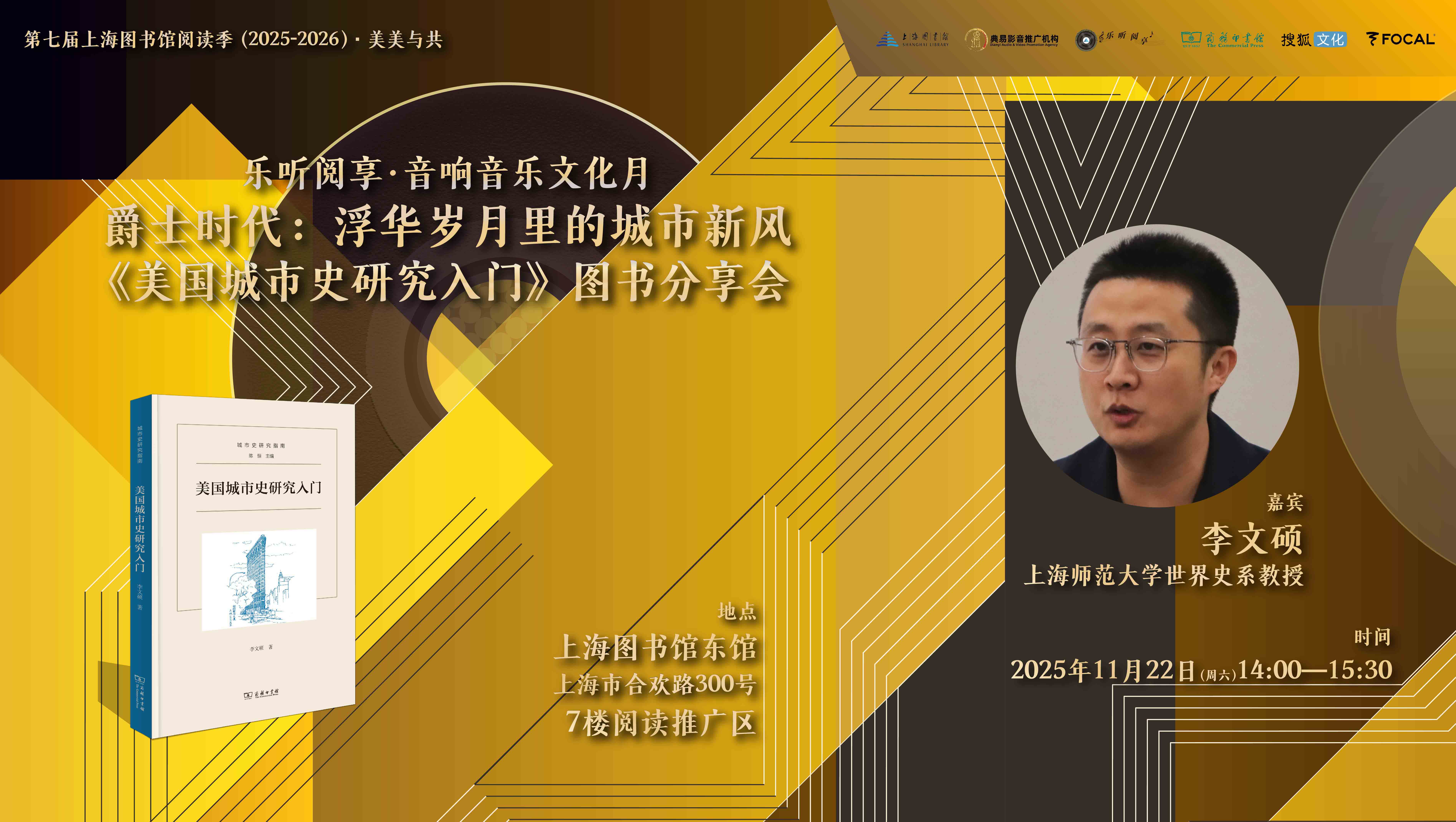 11月22日,以“爵士时代:浮华岁月里的城市新风”为主题的《美国城市史研究入门》图书分享会在上海图书馆顺利举办。本次分享会为上海图书馆“乐听阅享·音响音乐文化月:Art Deco时代的爵士回响”系列讲座之一,邀请上海师范大学世界史系教授李文硕携其作品《美国城市史研究入门》,与读者一同通过音乐、电影、历史图片等资料,领略一个真实而鲜活的“爵士时代”。李教授以爵士乐的兴衰串起三座城市,讲述一段非洲裔美国人迁徙、抗争与创造的历史。