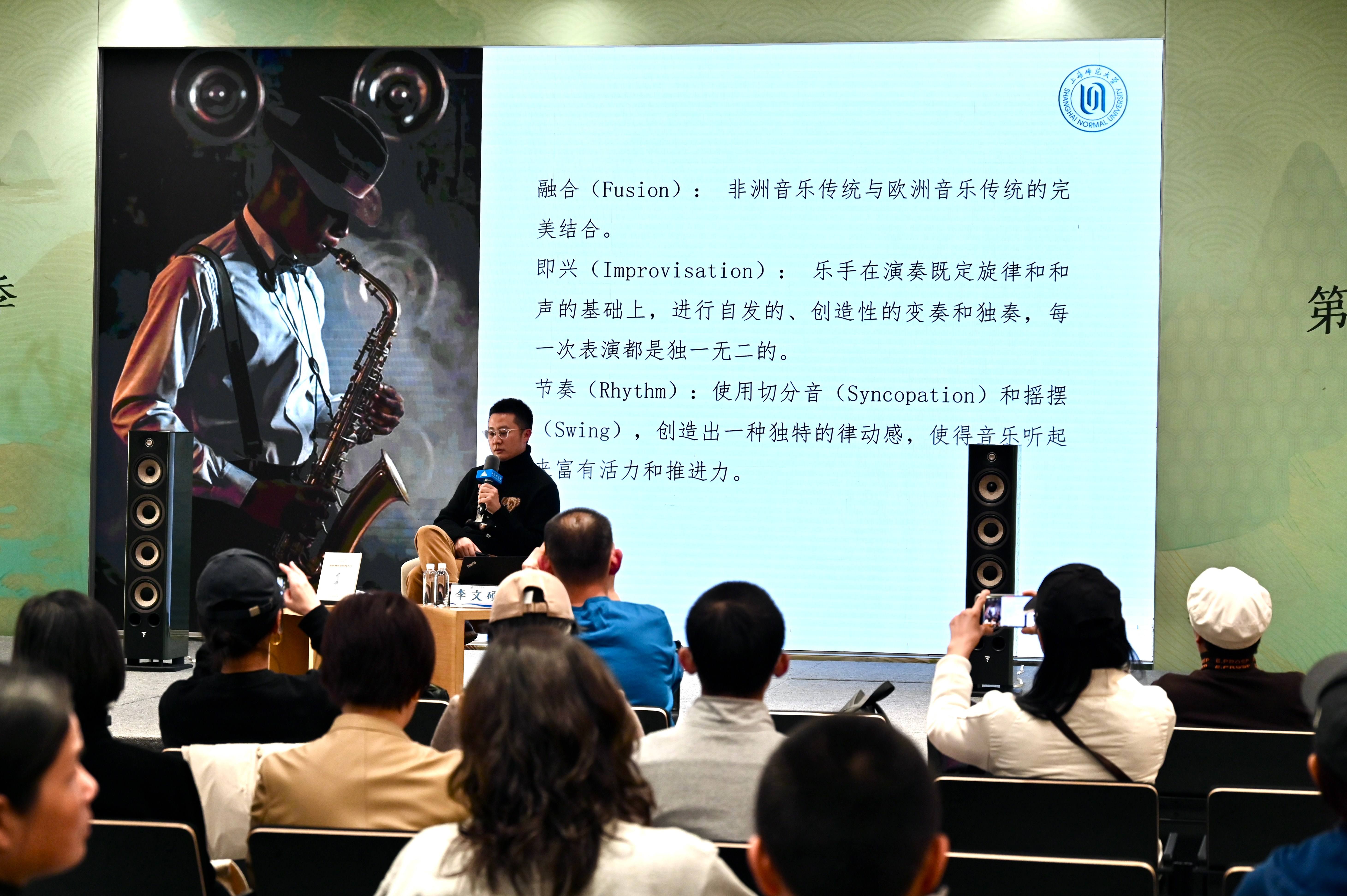 在分享会伊始,李教授介绍了爵士乐的内涵与特征。他表示,爵士最初用于描述棒球手变化莫测的投球技术,后来进入主流文化,特指新颖、有活力的现象,最后被固定指代一种源于美国南部非洲裔群体的音乐类型。爵士乐有融合、即兴、节奏三大特征,混合了非洲节奏传统、欧洲音乐元素、加勒比风格以及美国本土文化,多为现场即兴创作,极具活力与煽动性,展现了被奴役的非洲裔以音乐的方式“呐喊自由”的本质。