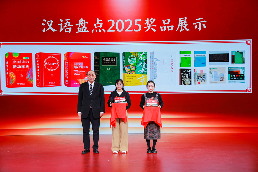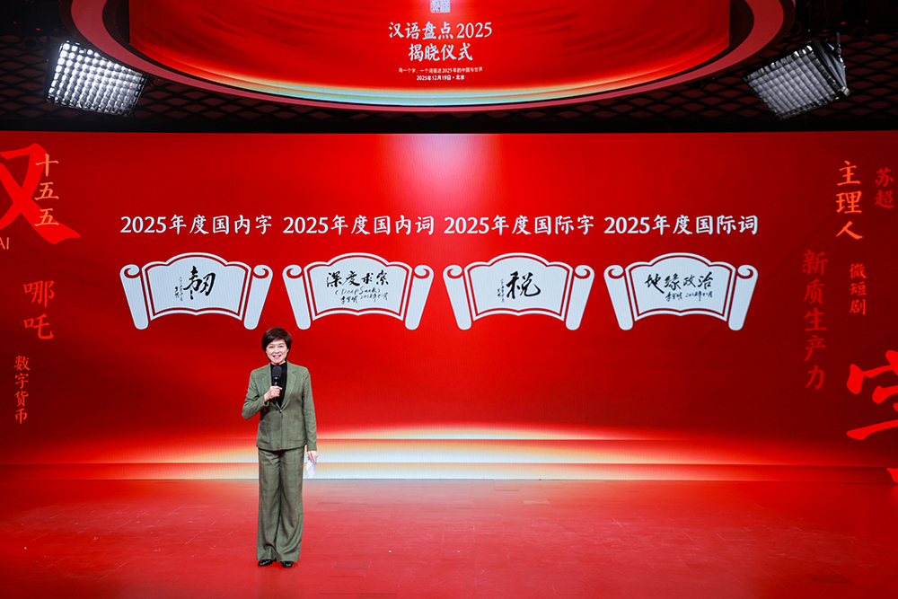 12月19日,国家语言资源监测与研究中心、商务印书馆、新华网联合主办的“汉语盘点2025”揭晓仪式在京举行。“韧”“深度求索(DeepSeek)”“税”“地缘政治”分别当选年度国内字、国内词、国际字、国际词。中宣部宣传舆情研究中心党委委员、“学习强国”学习平台副总经理魏星,新华网总裁申江婴,中国出版集团有限公司副总经理、党组成员陈永刚,商务印书馆党委书记、执行董事顾青,新华网副总裁刘加文,中国新闻文化促进会副会长陆先高,中国经济体制改革研究会常务理事、创新体制机制研究专业委员会副主任祝华新,北京语言大学教授杨尔弘,华中师范大学教授何婷婷,中国传媒大学教授邹煜,武汉大学教授赫琳,北京外国语大学教授张天伟,科大讯飞华北区域品牌总监杨浩,方正字库副总经理黄学钧,清博智能品牌运营中心负责人牟喜媛等嘉宾揭晓并点评年度字词,发布媒体十大热词、十大新词语、十大网络流行语,华中师范大学教授刘延申为获奖网友代表颁奖。中国辞书学会会长、北京语言大学教授李宇明,中国经济体制改革研究会常务理事、创新体制机制研究专业委员会副主任祝华新,中央民族大学副教授向安玲就“语言·人文·科技”话题接受访谈。汉语盘点活动的策划者和发起人李宇明教授为活动泼墨题字,著名主持人敬一丹主持揭晓仪式。