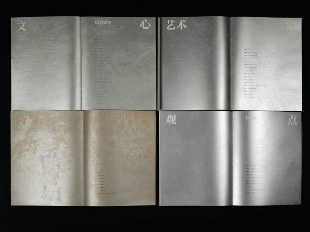 全书使用多种特种纸,篇章页使用月影白色,以太湖石肌理进行视觉转换,凝固了时间与记忆。根据不同栏目的具体内容,选用多款艺术纸张交替组合:“文心”部分使用夕彩米色,纸张柔和,凸显文字中的沉稳;“艺术家”“影像”和“观点”部分使用艾力克超感(有光)米色,使得图案印刷更具色彩;“诗与音乐”部分使用半月槐花米和艾力克超感(有光)米色,质感古朴,仿佛走入回忆里的故事之中。由此区别板块,强化了版块个性特征,更好地还原了艺术摄影作品的原貌。