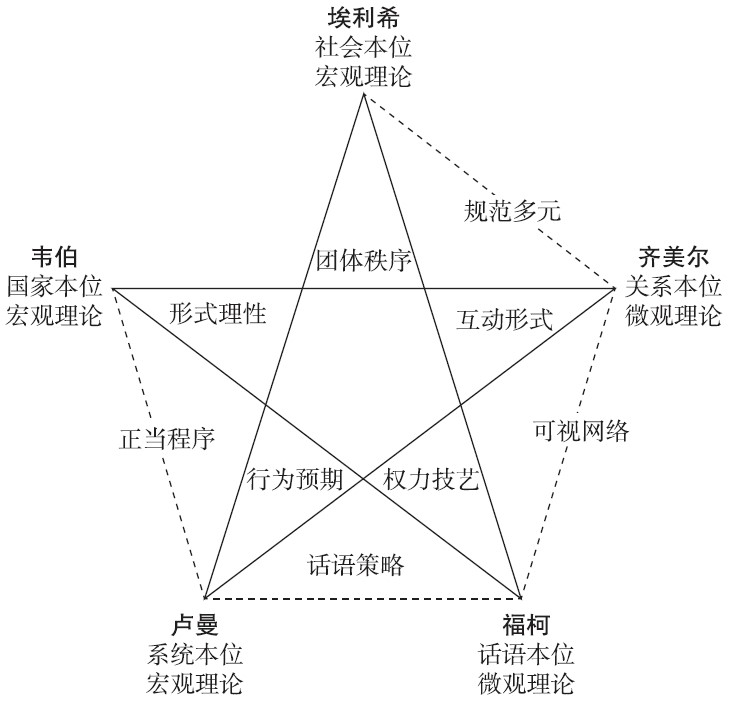 在这里,我试图对法社会学的三个宏观理论和两个微观理论之间的相互关系和相互作用进行定位。其中实线表示相反相成的关系。由此构成五角星图案,各角里的文字分别记述了所对应理论体系的核心主张或关键概念,即形式理性、团体秩序、互动形式、权力技艺、行为预期。虚线则表示相辅相成的关系。通过虚线联结各角,以规范多元、可视网络、话语策略、正当程序把不同的理论衔接起来,就使本来相互对峙的团体秩序与形式理性之间也能建立起曲径通幽的回廊。其实这也正是我一直强调的解决中国社会现代化这道几何学难题时理应找到并画出来的辅助线。这种间接地达到目标之虚线相互贯通的底层逻辑是:社会本位在本质上可以归结为关系本位;关系因沟通而形成并稳定化,因而关系本位势必导向话语本位;基于话语的沟通行为是系统的最小单位,所以话语本位与系统本位在本质上是一体化的;系统本位实际上也很容易通过正当程序和沟通行为指向国家本位,因为系统的行为预期与国家的形式理性本来就灵犀相通的。借助这样的构图和连线,我们可以发现大相径庭的学说之间存在的关联性,可以获得对法社会学理论图谱整体的不同印象和不同理解。后续各章就以前述五角星形状及其构成因素之间的各种关系为背景和线索,逐一讲读法社会学领域的五种经典理论的内容以及学说族谱。虽然也夹杂着学术性批评(并非意识形态化的批判),但整体上还是采取兼容并蓄、扬长避短的态度。