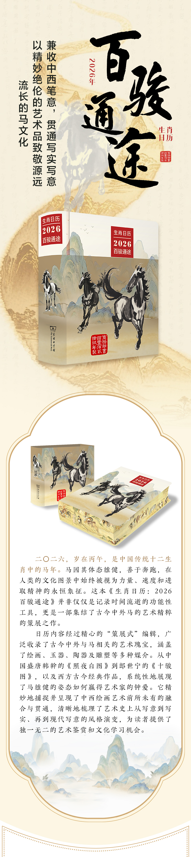 二〇二六,岁在丙午,马年日历《百骏通途》不仅是记录时间的工具,更是献给每一位进取者的史诗级艺术图鉴。它以马为引,串联起源远流长的马文化与人类文明进程,展现了马在塑造人类历史中的重要地位。