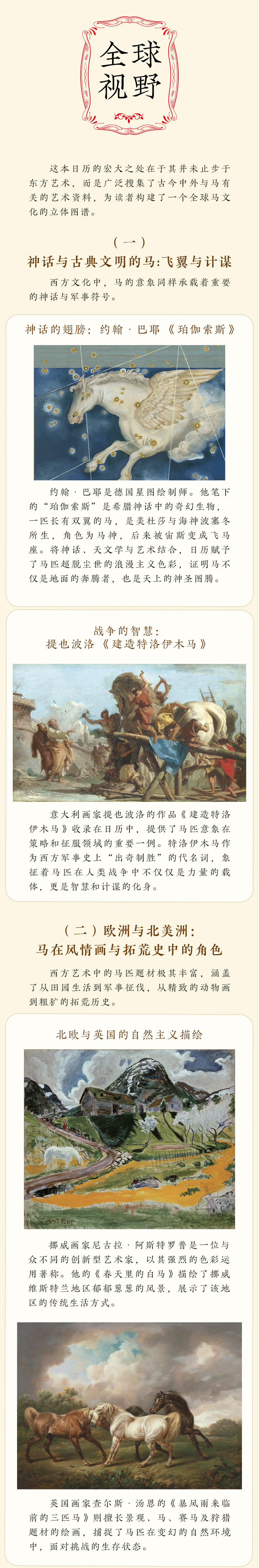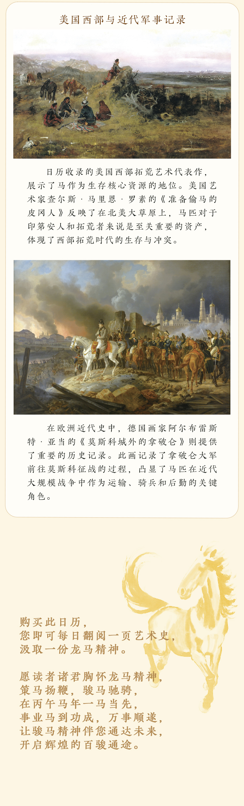 购买此日历,就是每日翻阅一页艺术史,汲取一份龙马精神。愿读者诸君胸怀龙马精神,策马扬鞭,骏马驰骋,在丙午马年一马当先,事业马到功成,万事顺遂!